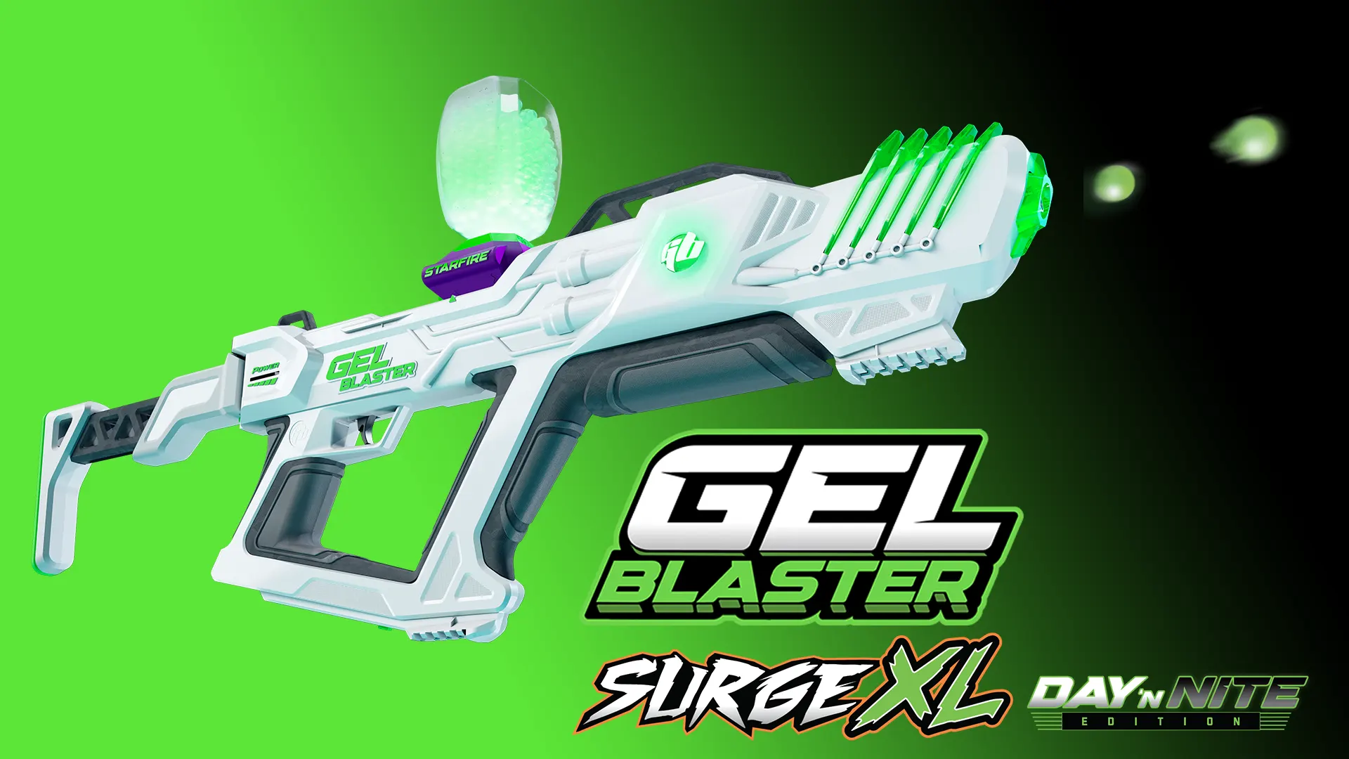 Co najważniejsze, edycja Day'n'Nite jest wyposażona w nasz nowy aktywator Starfire. Aktywator wykorzystuje technologię oświetlenia UV do doładowania kulek Gellets Starfire, aby świeciły w ciemności i tworzyły świecący efekt, który trzeba zobaczyć, aby uwierzyć.