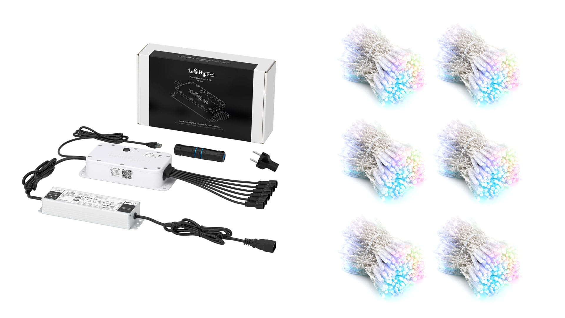 W skład zestawu wchodzi: - 6 łańcuchów Twinkly PRO Strings 250 RGBW LED, 25 metrów każdy; - 1 kontroler Twinkly PRO Ethernet Controller, 6 portów, max 1500 LED, zasilacz AC/DC.