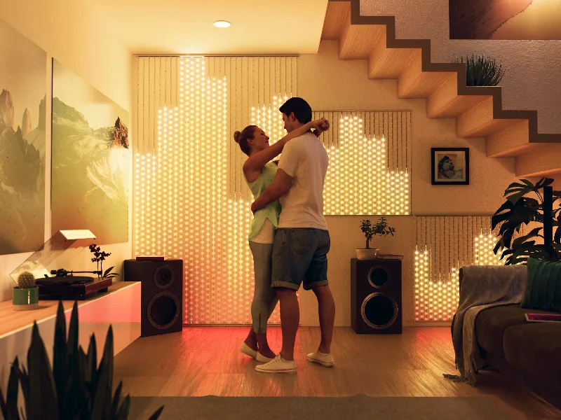 Obserwuj, jak światła reagują na dźwięki w czasie rzeczywistym dzięki urządzeniu Twinkly Music (sprzedawane oddzielnie). Posiada bardzo dokładny licznik BPM i inteligentny mikrofon, który nasłuchuje i interpretuje dźwięki otoczenia.